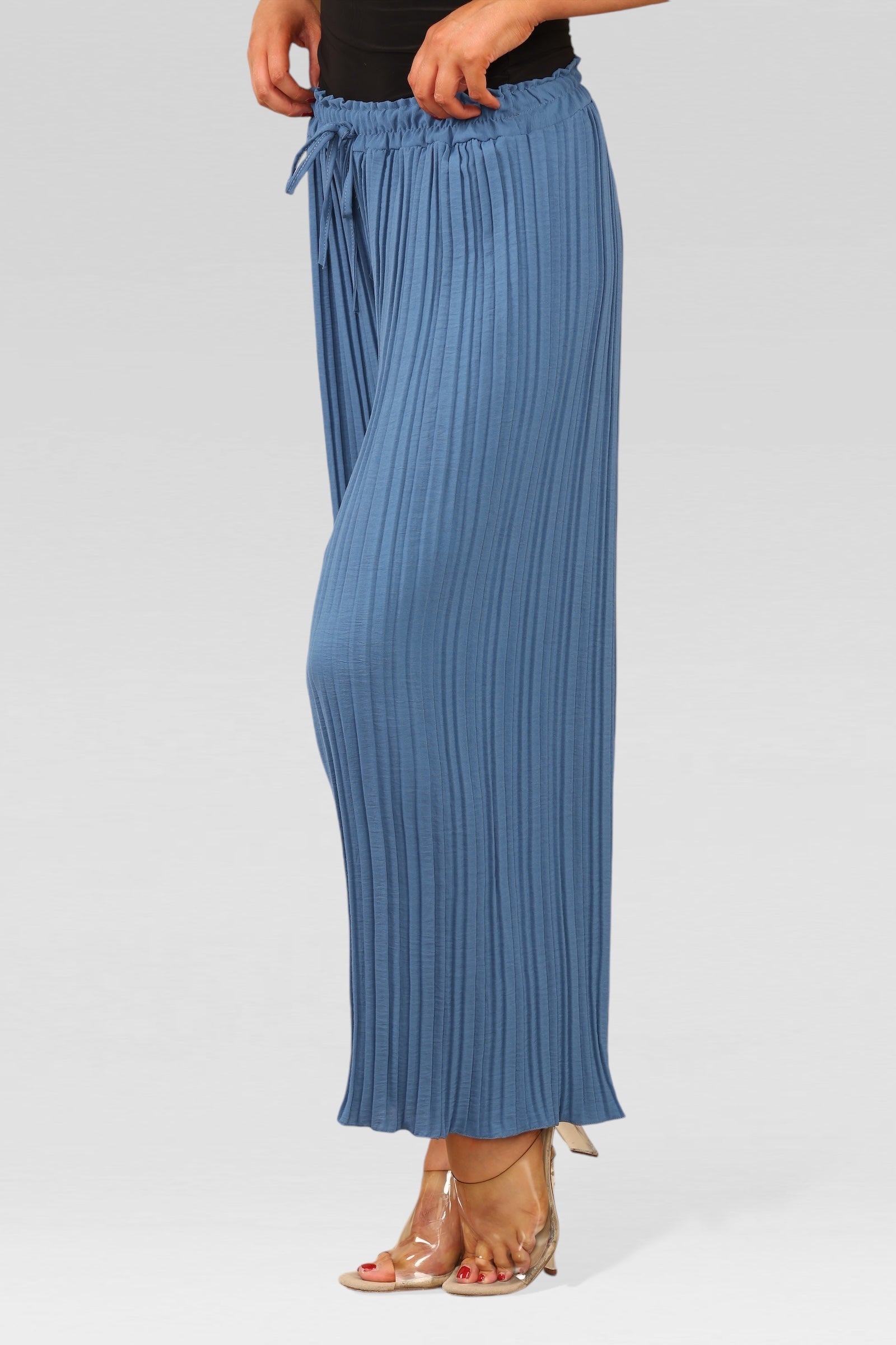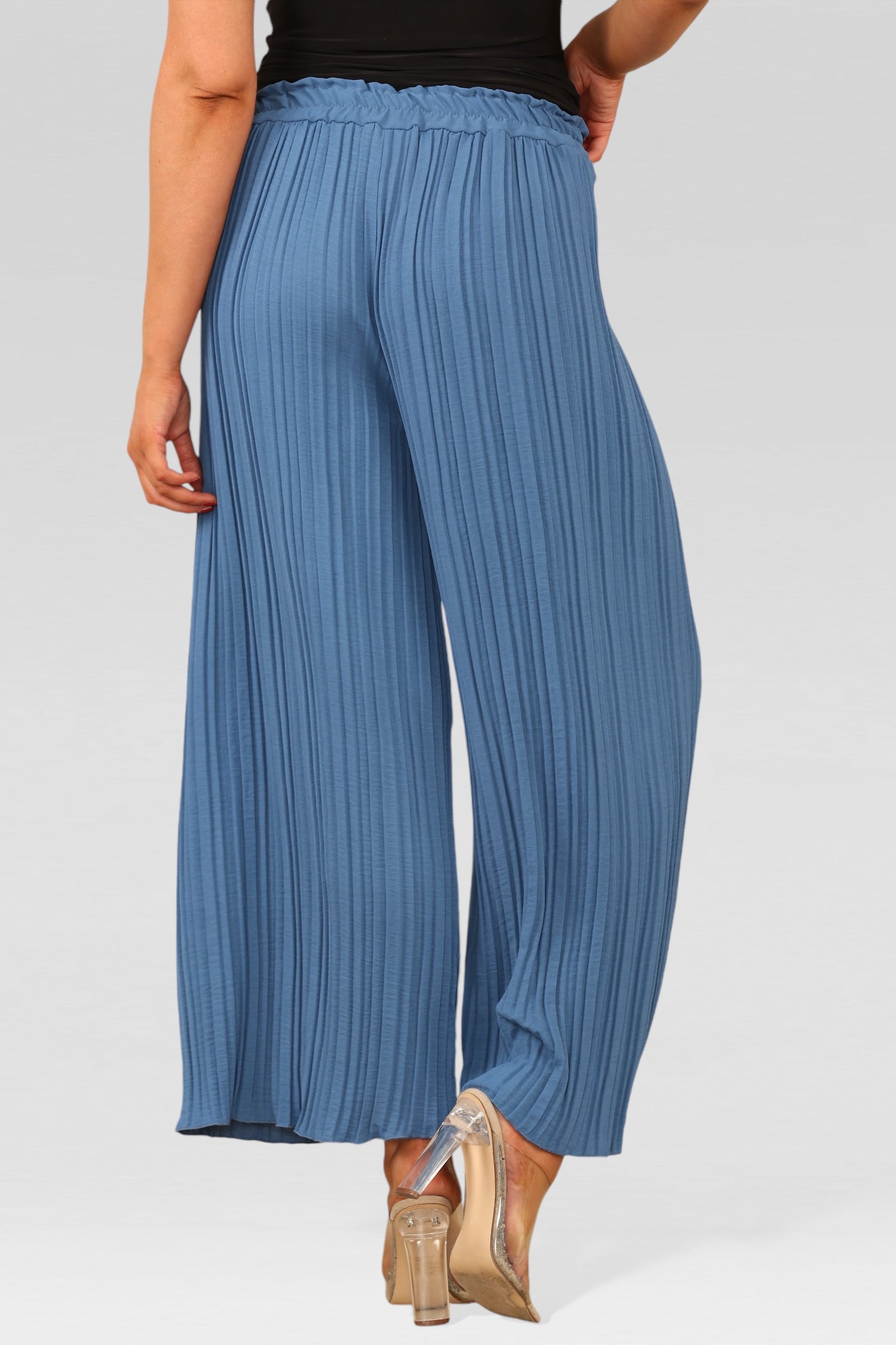 Step into style with our Wide Leg Plissé Pleated Trousers in denim blue. Featuring an elasticated waist and elegant pleats, they offer comfort with a chic, flowy silhouette. One size fits UK 8–18 — perfect for dressing up or down with ease.