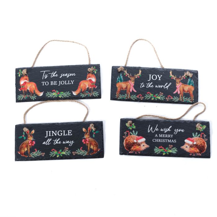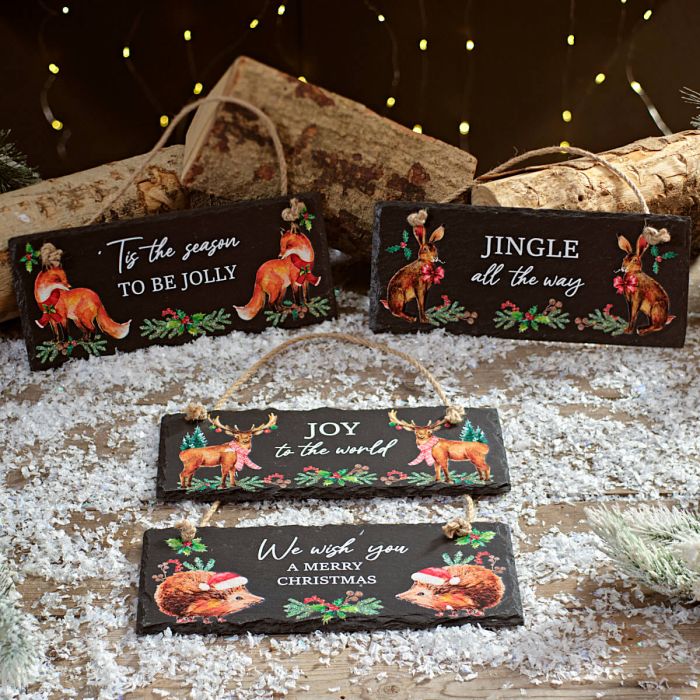 Plaques featuring woodland animals and holiday phrases with a jute hanging cord, black background. Each plaque displays a different animal illustration including fox, deer, rabbit, and hedgehog, along with festive text and holly accents.